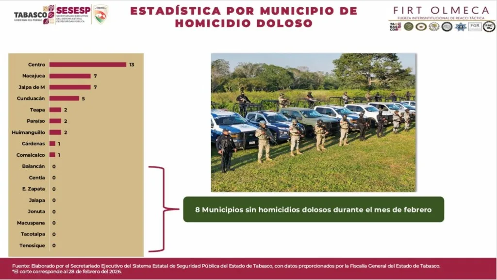 El secretario Ejecutivo del Sistema Estatal de Seguridad Pública (SESESP), Francisco Javier Zúñiga Hernández informó este lunes que en Tabasco hay una disminución durante febrero del 62.16 por ciento en homicidios dolosos, así como una baja generalizada en diversos delitos.