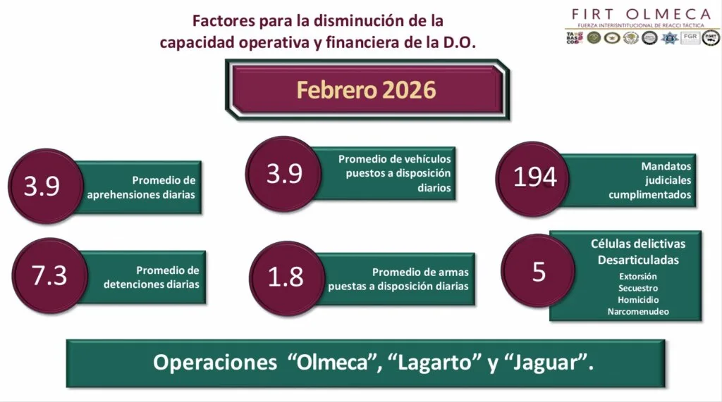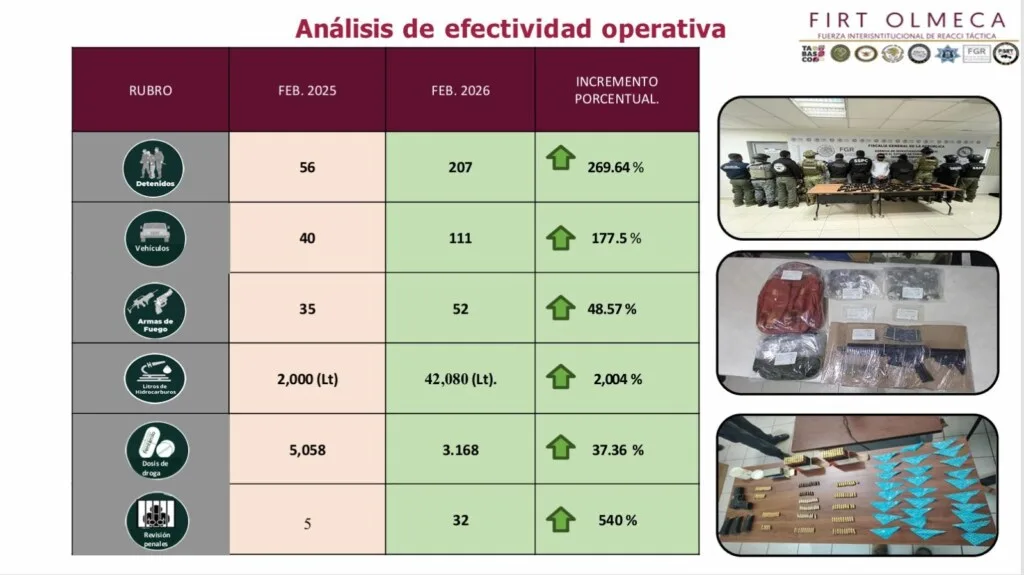 Precisó que, en el análisis de efectividad operativa, en febrero 2026 comparado con el 2025, se refleja un incremento del 269.64 por ciento en detenidos, 177 por ciento en vehículos asegurados, 48.57 por ciento en armas de fuego, 2 mil 4 por ciento en litros de hidrocarburo recuperados, 37.36 por ciento en dosis de droga incautadas, y un aumento de 540 por ciento en acciones de revisión a penales.