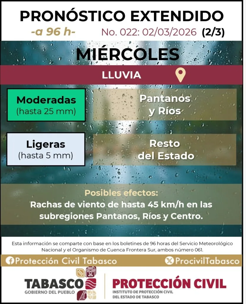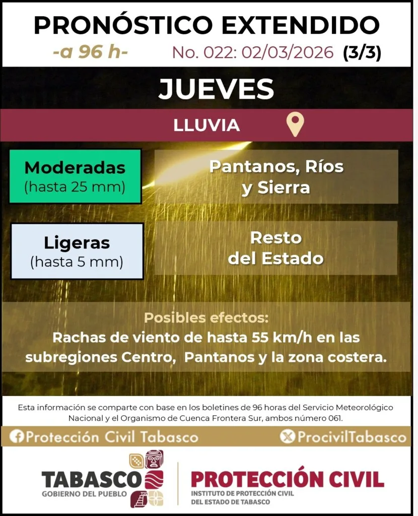 El Instituto de Protección Civil del Estado de Tabasco informó que en las próximas 96 horas se prevé el desarrollo de lluvias y chubascos en la entidad, debido a la presencia de canales de baja presión.