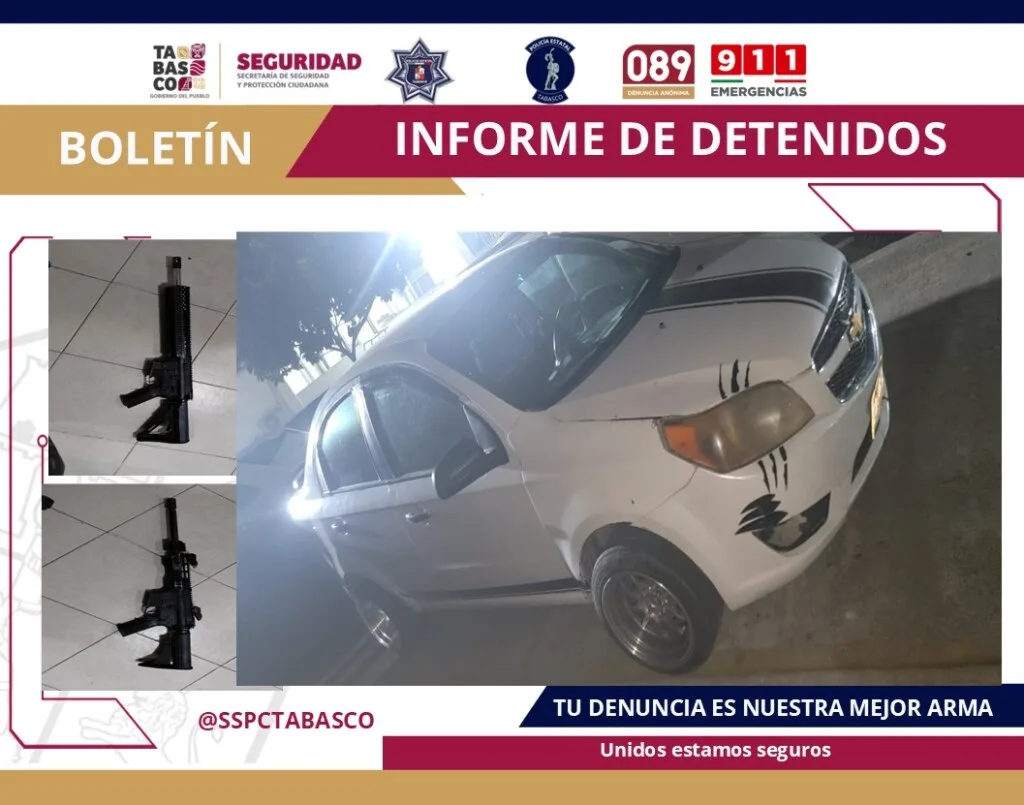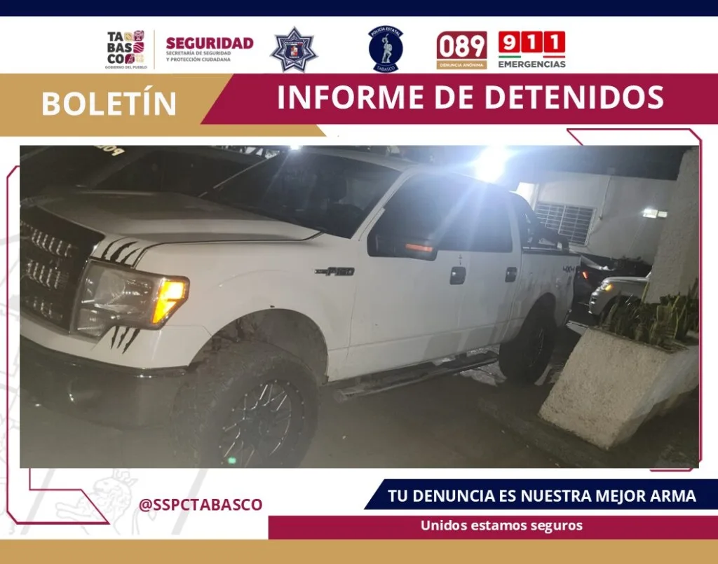 Asimismo, se aseguraron dos vehículos, uno de la marca Chevrolet, modelo Aveo, tipo sedán, con placas del estado de Tabasco; y otro de la marca Ford, modelo F-150, con placas del estado de Chiapas.