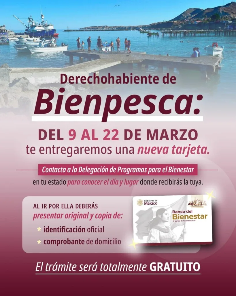 A partir de este 9 de marzo comenzará el proceso de renovación de tarjetas del programa Bienpesca para las y los beneficiarios registrados en el padrón 2025, informó la Comisión Nacional de Acuacultura y Pesca (Conapesca).