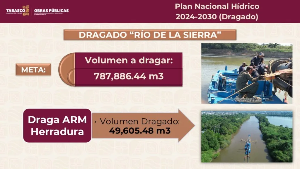 En lo que respecta al dragado del río de La Sierra, refirió que registra un avance de 49 mil 605 metros cúbicos de los 787 mil a dragar, y el propósito es mitigar los riesgos de inundación de la población. “Recordar que este afluente genera varias adversidades normales y naturales aguas arriba y pues sobre eso va trabajando el equipo de Marina”.