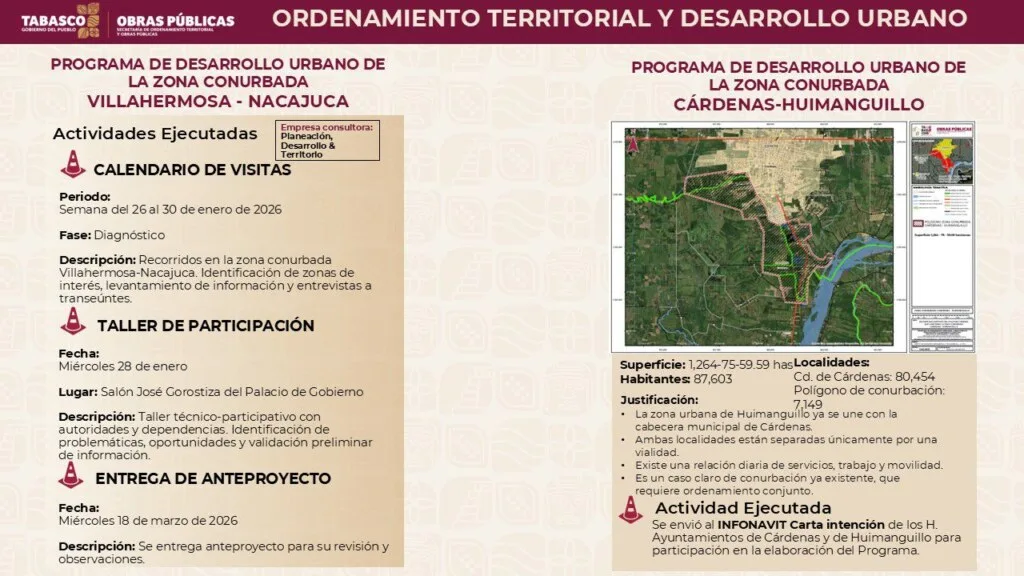 Refirió que a la fecha se tienen identificadas mil 264 hectáreas de atención en el polígono comprendido entre ambos municipios y que, en coordinación con el Instituto para el Fondo Nacional de la Vivienda de los Trabajadores (INFONAVIT), se pueda instalar la Comisión de Conurbación y ejecutar el programa, tal como ocurrió en el caso de la zona conurbada Villahermosa-Nacajuca.