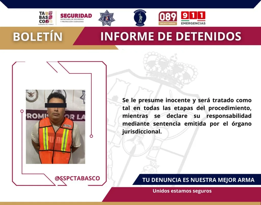 De acuerdo con el reporte oficial de la Secretaría de Seguridad y Protección Ciudadana de Tabasco, la detención se llevó a cabo en la cerrada Manuel Rodríguez, en la zona de Villa Parrilla, donde los agentes interceptaron a Diego Armando “N”, alias “Oteo”, de 30 años de edad.