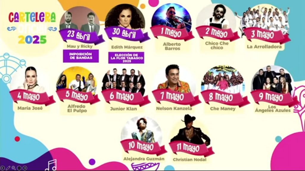 SARA AMADOR VERA / EL EDÉN MX La Feria Tabasco, “La feria del pueblo” será inclusiva, ya que los conciertos serán gratuitos para todos, sostuvo el gobernador Javier May. Para la fiesta anual que en la edición 2025 se llevará a cabo del 1 al 11 de mayo, se tiene confirmada la asistencia de cantantes […]