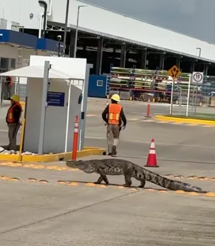 STAFF / EL EDÉN MX Trabajadores de la base operativa de Schlumberger, en la ranchería Anacleto Canabal 3ra. sección, municipio de Centro, captaron en video a un enorme cocodrilo paseando tranquilamente por las instalaciones. El avistamiento sorprendió a los empleados, quienes documentaron el momento mientras el reptil recorría el área sin aparente temor.