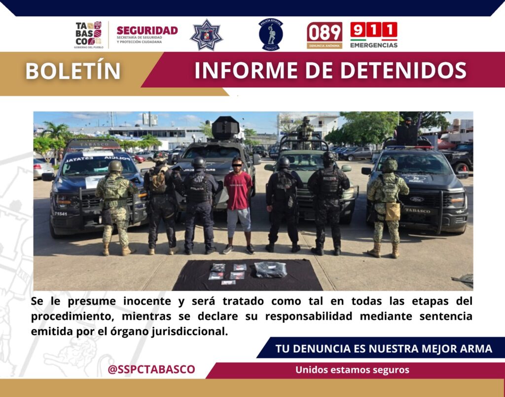 Como parte de la Estrategia Antiextorsión y del Plan de Contención del Delito, desplegado por la Fuerza Interinstitucional de Reacción Táctica (FIRT) Olmeca, en coordinación con la Secretaría de Seguridad y Protección Ciudadana (SSPC) de Tabasco, se logró la detención de una persona por su probable responsabilidad en delitos contra la Ley General de Salud. […]