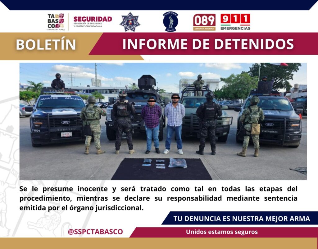 Por su probable responsabilidad en delitos contra la Ley General de Salud, la Secretaría de Seguridad y Protección Ciudadana (SSPC), en coordinación con la Fuerza Interinstitucional de Reacción Táctica (FIRT) Olmeca, detuvo a dos personas. La acción operativa se llevó a cabo en las inmediaciones de la calle Francisco I. Madero, en Villa Playas del […]