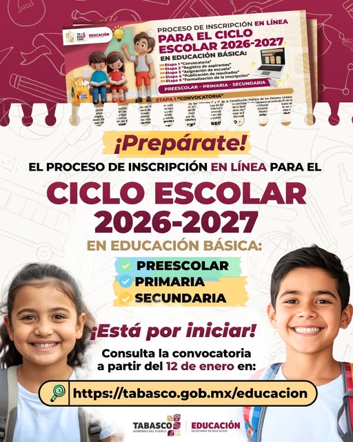 La Secretaría de Educación de Tabasco (Setab) se prepara para iniciar el proceso de inscripción al ciclo escolar 2026-2027 en educación básica (preescolar, primaria y secundaria).A través de redes sociales, la dependencia a cargo de Patricia Iparrea Sánchez, informó que el proceso podrá llevarse a cabo en línea y consta de cinco etapas:1) Convocatoria2) Registro […]