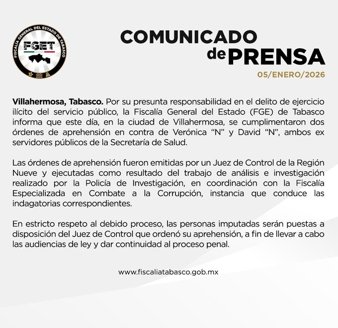 La Fiscalía General del Estado de Tabasco informó de la cumplimentación de dos órdenes de aprehensión contra Verónica “N” y David “N”, ambos ex servidores públicos de la Secretaría de Salud, por su presunta responsabilidad en el delito de ejercicio ilícito del servicio público. De acuerdo con la FGE, los mandamientos judiciales fueron emitidos por […]