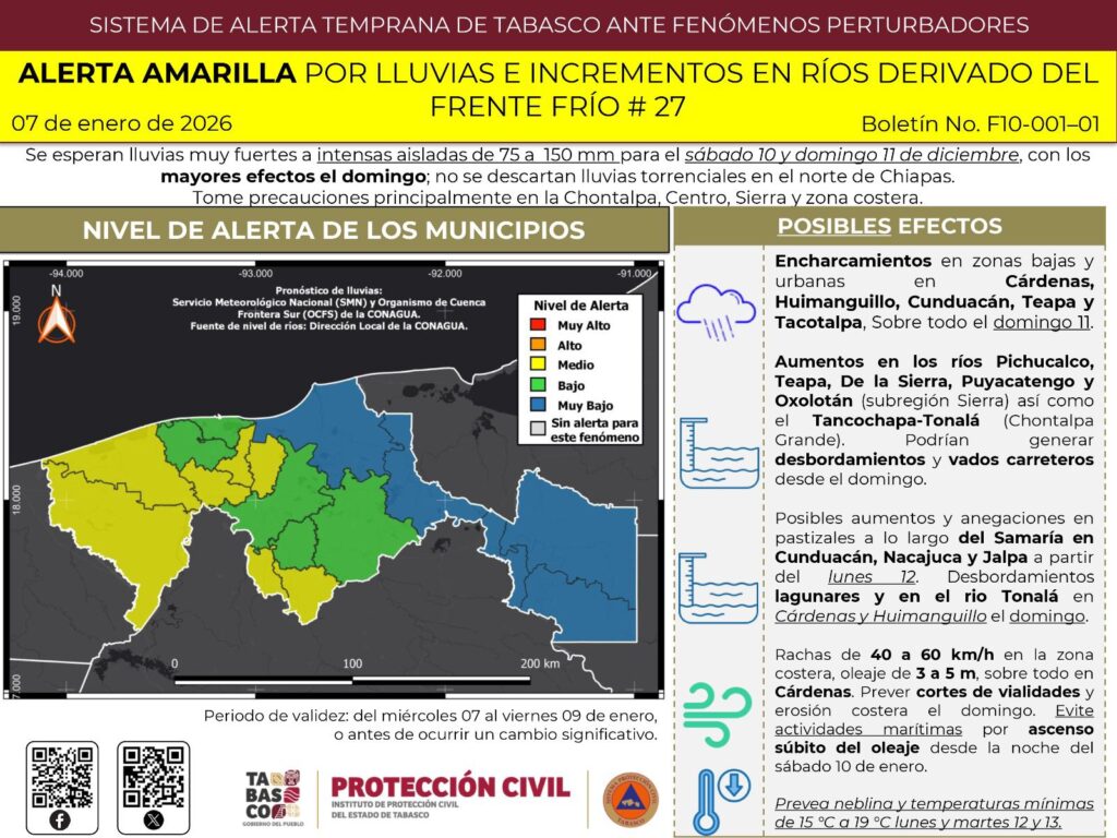 El Instituto de Protección Civil del Estado de Tabasco (IPCET) informa la emisión de Alerta Amarilla y mantiene monitoreo permanente ante los efectos del Frente Frío número 27, el cual provocará condiciones meteorológicas adversas en la entidad. De acuerdo con el pronóstico, se prevén lluvias muy fuertes a intensas aisladas, con acumulados estimados de 75 […]