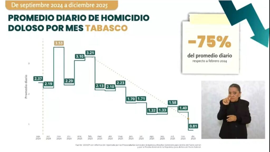 Destaca Gobierno de México a Tabasco por disminución de homicidios al cierre de 2025