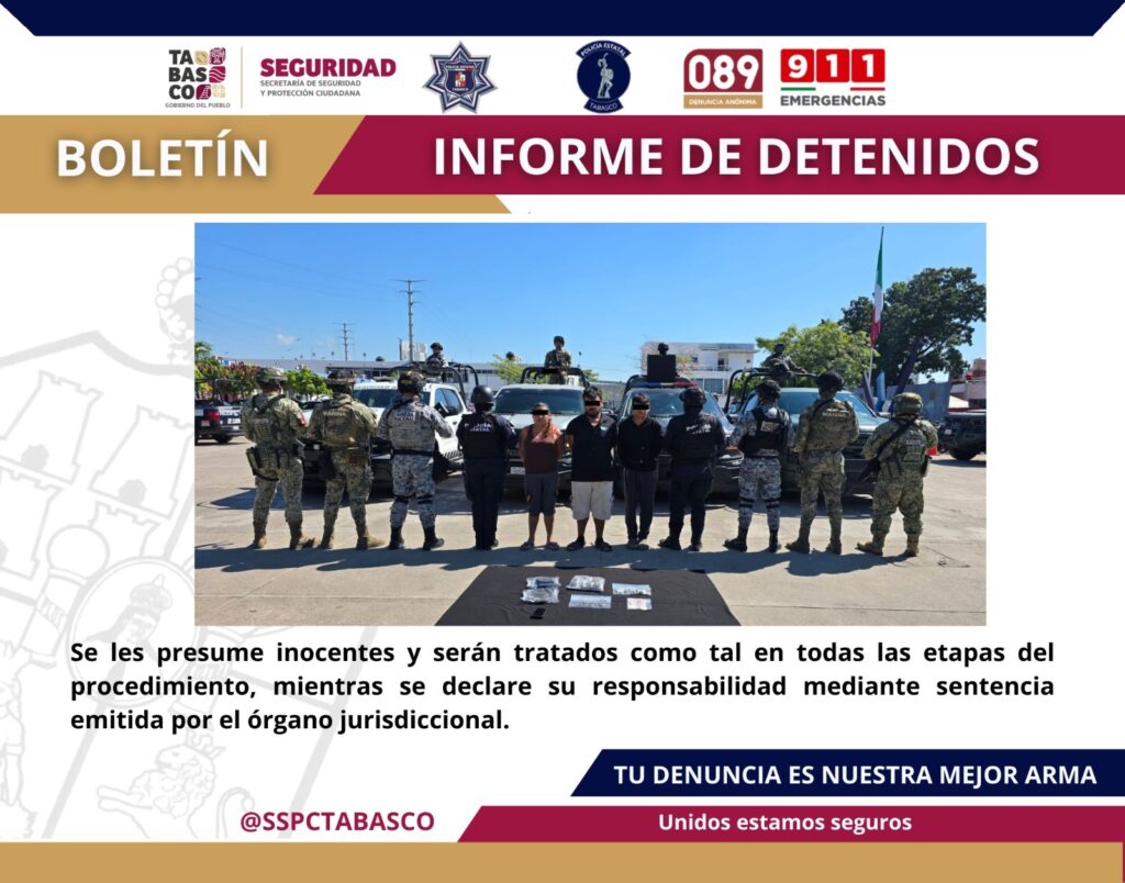 La Secretaría de Seguridad y Protección Ciudadana (SSPC), en coordinación con la Fuerza Interinstitucional de Reacción Táctica (FIRT) Olmeca, llevó a cabo acciones operativas en las inmediaciones del Fraccionamiento Villa del Cielo, del municipio de Centro, dando como resultado 3 personas detenidas por su probable responsabilidad en delitos contra la Ley General de Salud. Los […]