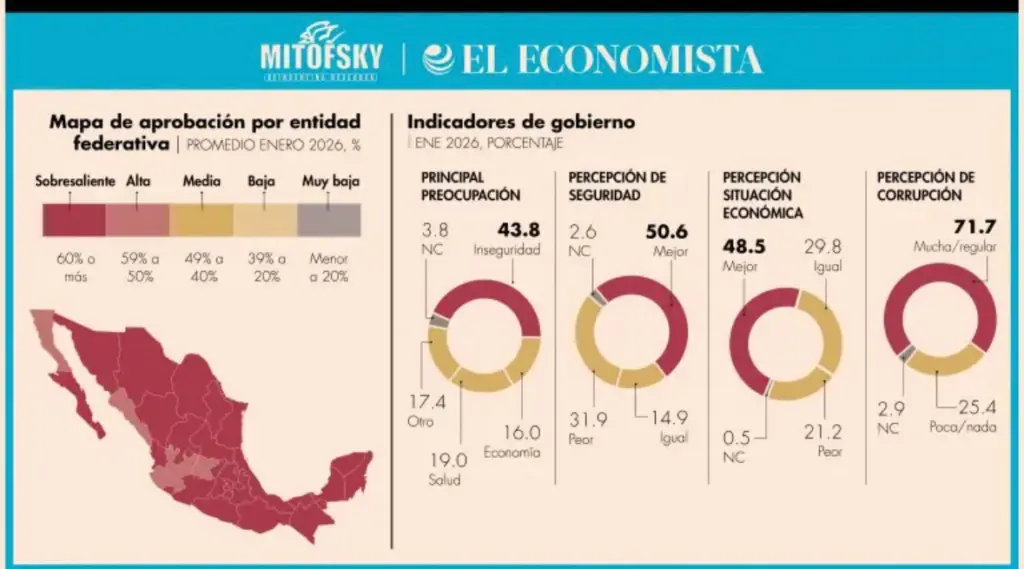 En el arranque del año, la presidenta Claudia Sheinbaum Pardo registró un 69.2% de aprobación nacional en promedio sobre su desempeño gubernamental, de acuerdo con datos publicados por El Economista. La cifra representa un incremento de 4.7 puntos respecto a enero de 2025, aunque es 0.3% menor en comparación con diciembre pasado. El estudio también […]