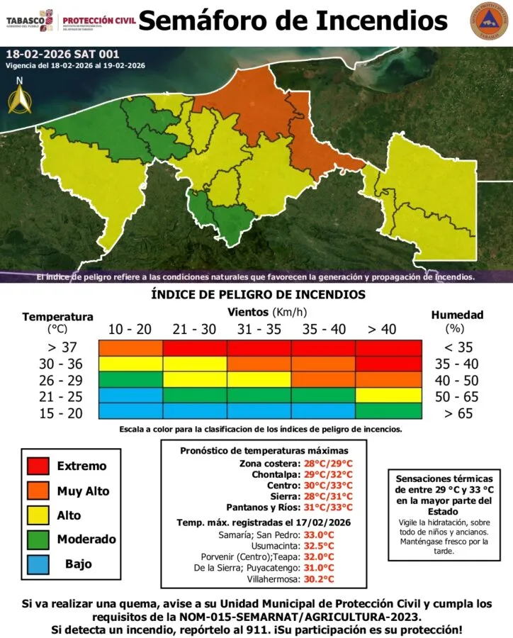 El Instituto de Protección Civil del Estado de Tabasco informó que en la entidad prevalece un pronóstico sin lluvias, con ambiente caluroso durante el día y relativamente templado por la noche, lo que incrementa el riesgo de incendios en diversas regiones. De acuerdo con el reporte, las temperaturas oscilarán entre 15 °C y 30 °C […]