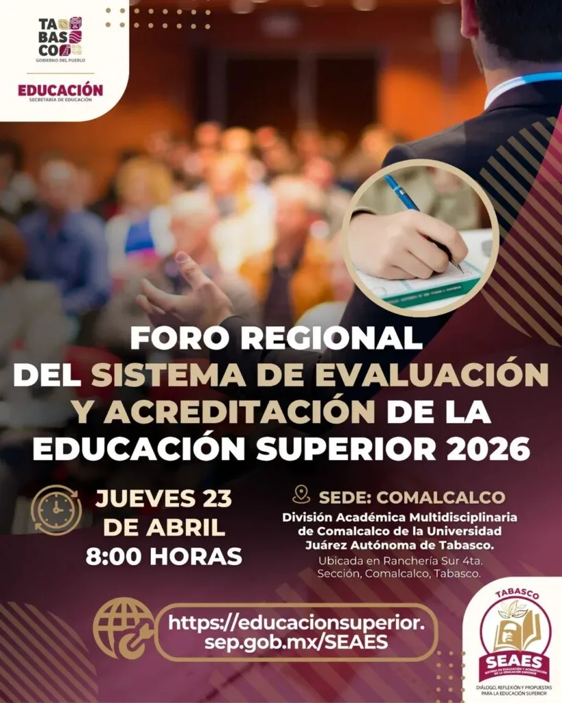 La Secretaría de Educación del Estado de Tabasco convocó a las Instituciones de Educación Superior públicas y particulares a participar en el Foro Regional Tabasco del Sistema de Evaluación y Acreditación de la Educación Superior (SEAES) 2026, un espacio académico orientado al análisis y fortalecimiento de los procesos de calidad educativa en la entidad. El […]