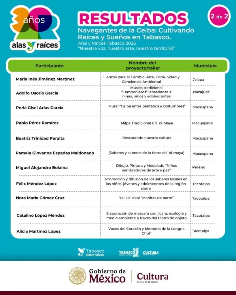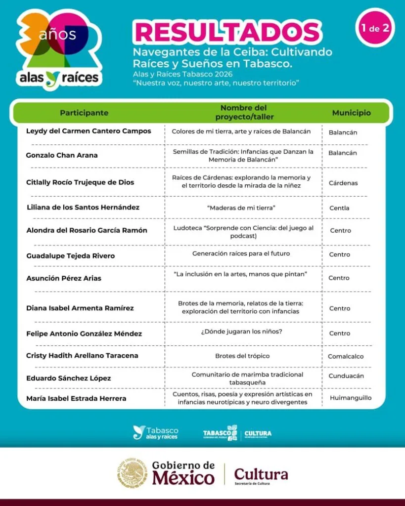 Para fomentar el desarrollo cultural desde las infancias y juventudes, el Gobierno del Estado, a través de la Secretaría de Cultura, dio a conocer los resultados de la convocatoria “Navegantes de la Ceiba: Cultivando Raíces y Sueños en Tabasco”, Alas y Raíces Tabasco 2026.