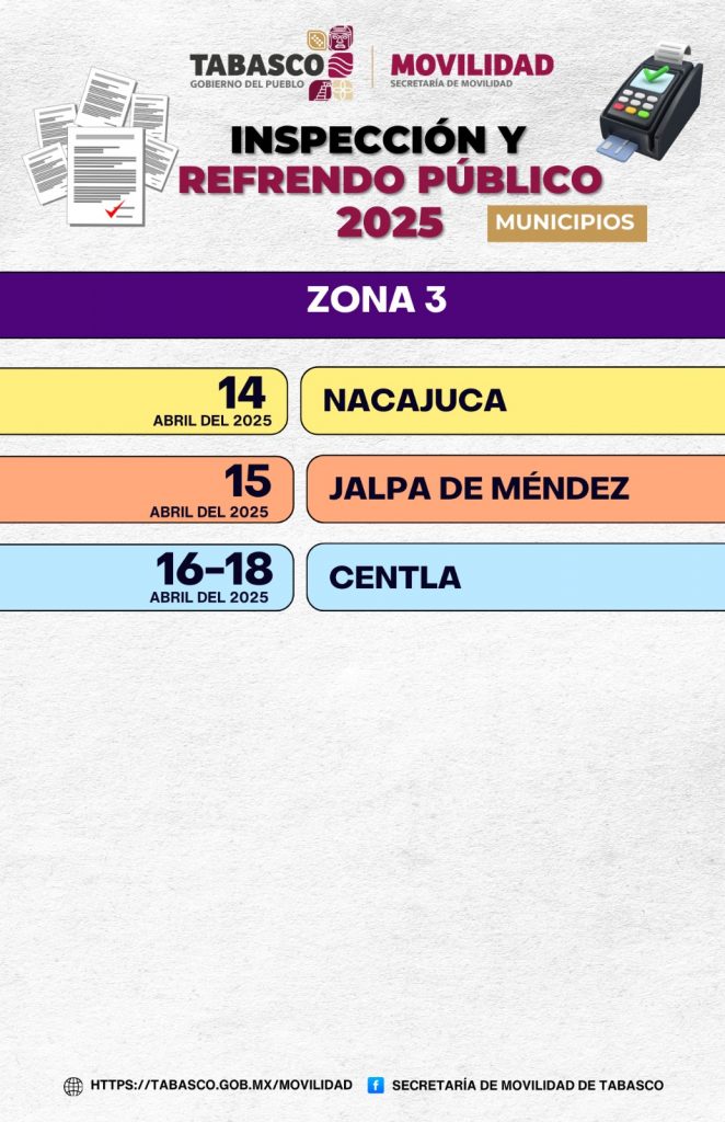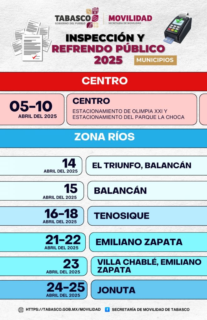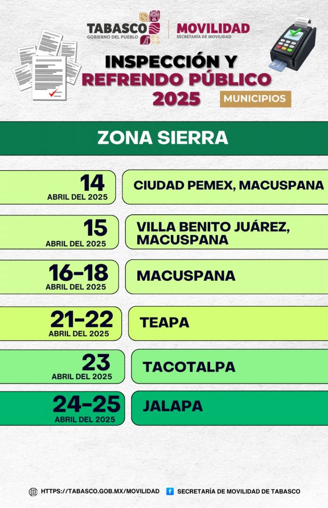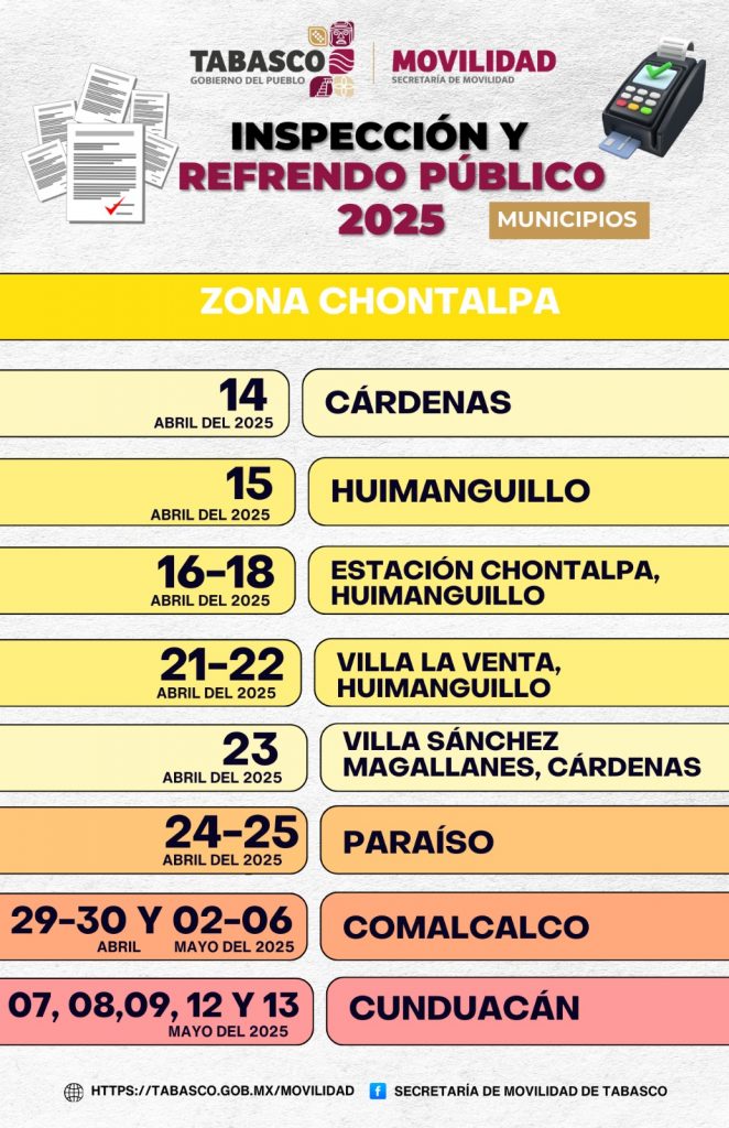 La dependencia recordó que la inspección es imprescindible para que los transportistas realicen el pago del refrendo 2025, por lo que el 23 de abril se instalarán módulos de atención en Villa Chablé́, Emiliano Zapata; Tacotalpa y Villa Sánchez Magallanes en Cárdenas; 24 y 25 de abril en Jonuta, Jalapa y Paraíso; 29 y 30 de abril y del 2 al 6 de mayo en Comalcalco; en tanto que los días 7, 8, 9, 12 y 13 de mayo se brindará atención en Cunduacán.