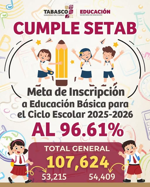 Tras concluir el proceso extraordinario de inscripción a educación básica, en Tabasco se cumplió con el 96.61% por ciento de la meta establecida, registrando un total de 107 mil 624 estudiantes, informó la Secretaría de Educación del Estado de Tabasco (SETAB).