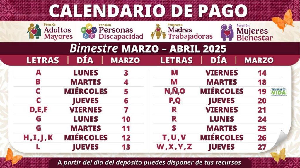 Montiel Reyes recordó que los depósitos bancarios se realizarán del 3 al 27 de marzo, de acuerdo con la inicial del primer apellido del derechohabiente. Para consultar el calendario de pagos, se puede acceder a la página oficial de la Secretaría de Bienestar: gob.mx/bienestar.