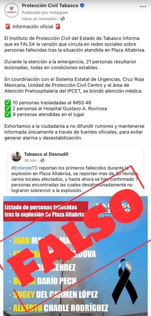 El Instituto de Protección Civil del Estado de Tabasco informa que es FALSA la versión que circula en redes sociales, de una lista de personas fallecidas tras la explosión registrada este lunes en Plaza Altabrisa, en Villahermosa.