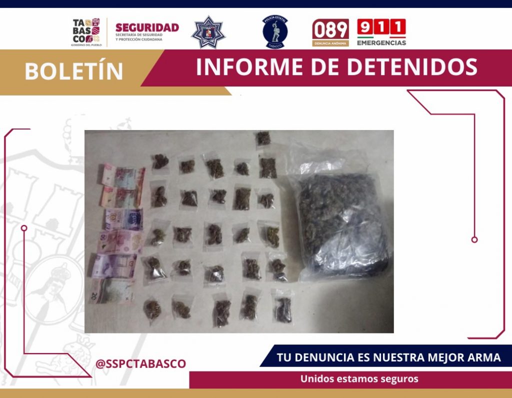 Elementos de la Secretaría de Seguridad y Protección Ciudadana (SSPC), en coordinación con la Fuerza Interinstitucional de Reacción Táctica (FIRT) Olmeca y el grupo especial Tabscoob, aseguraron a dos hombres por su presunta participación en delitos contra la salud en la modalidad de narcomenudeo.