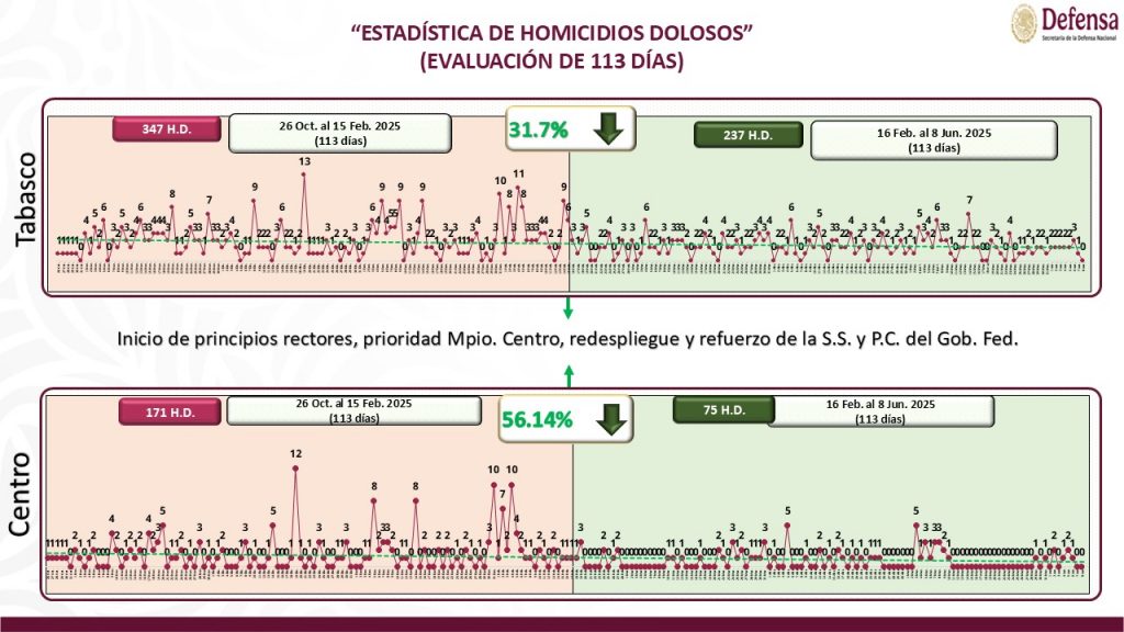 Disminución de homicidios dolosos del 30.10% a nivel estatal entre mayo de 2024 y mayo de 2025, en el municipio de Centro, la disminución fue del 12.5%, pasando de 40–50 homicidios mensuales a entre 18 y 21.