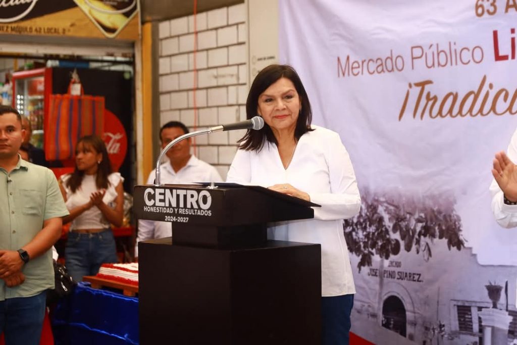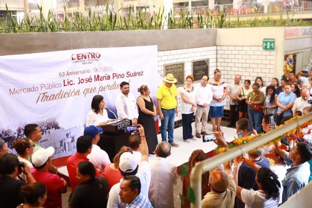 En convivencia con locatarios y clientes, la presidenta municipal Yolanda Osuna Huerta, partió el pastel conmemorativo con el que se celebró este sábado el 63º aniversario del mercado público “José María Pino Suárez”, por ser un ícono urbano de Villahermosa que representa nuestra identidad, cultura y tradición.