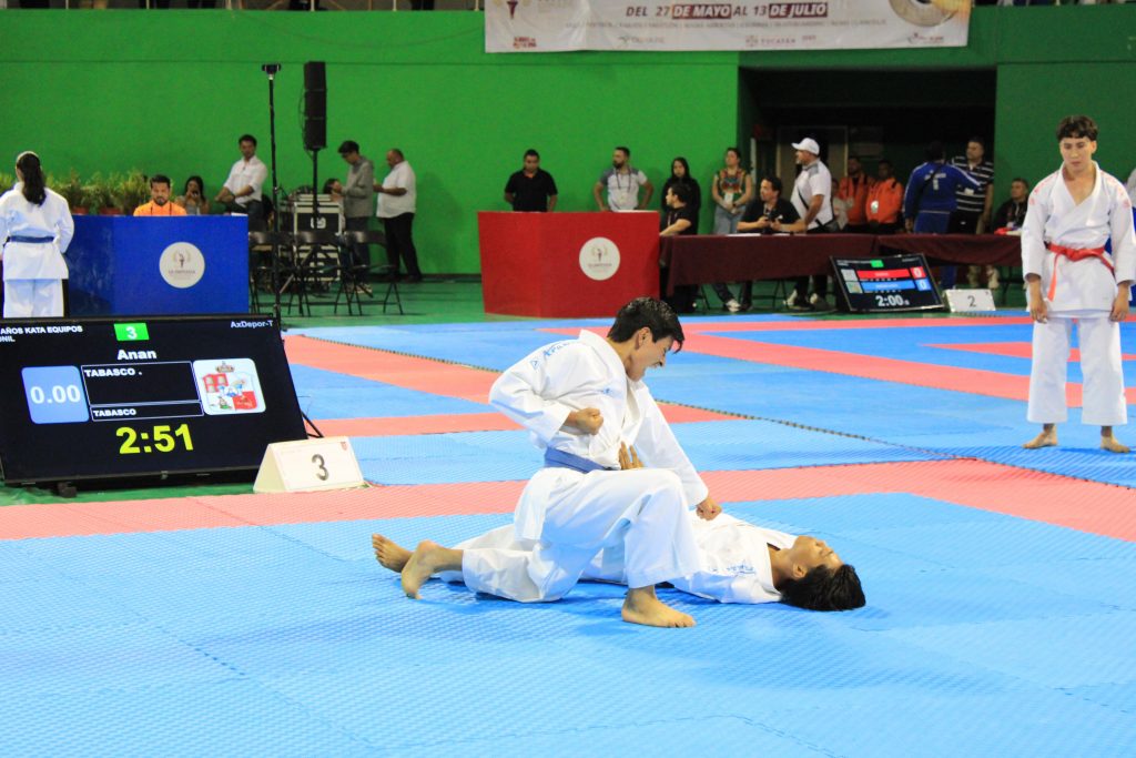 “Y la otra, por el equipo varonil de Kata conformado por Adrián Emmanuel Chan Hernández, Ángel Omar Sánchez Álvarez y Jonatan Asiel Sánchez Magdonel”.