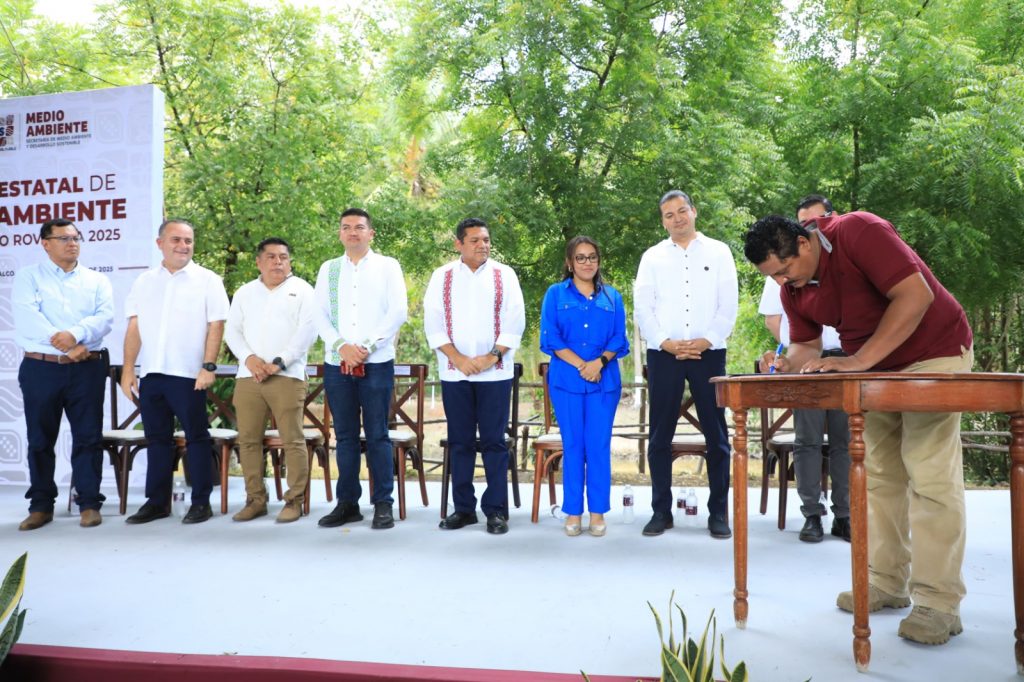 El gobernador Javier May Rodríguez encabezó la entrega del Premio Estatal del Medio Ambiente “José Narciso Rovirosa” 2025 y anunció el inicio del proceso para declarar a Cinco Lagunas como Área Natural Protegida, en un acto celebrado en el ejido Lázaro Cárdenas, municipio de Comalcalco.