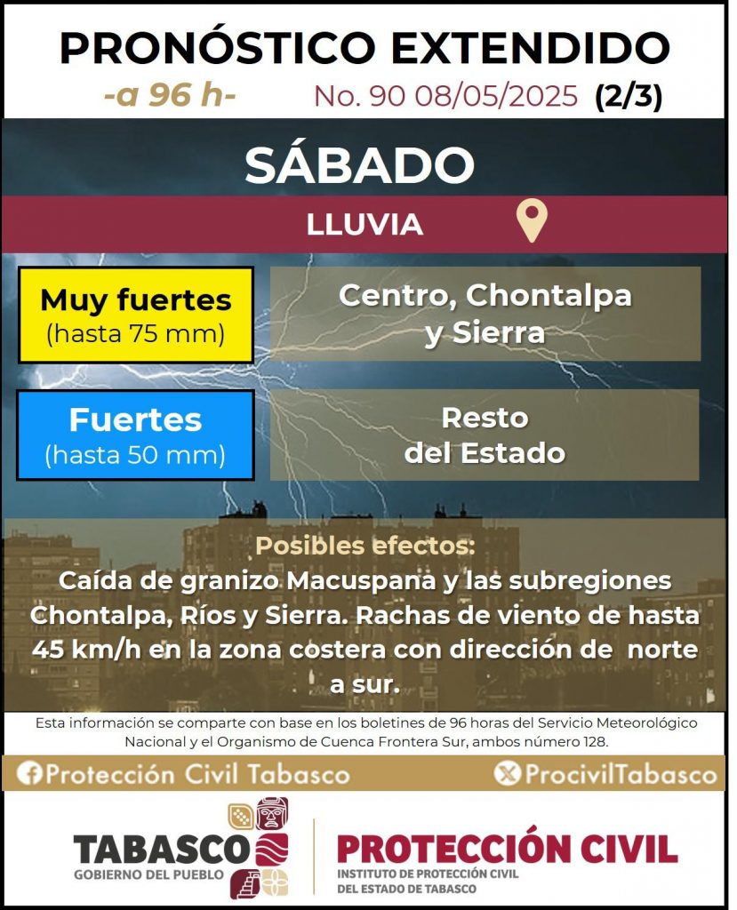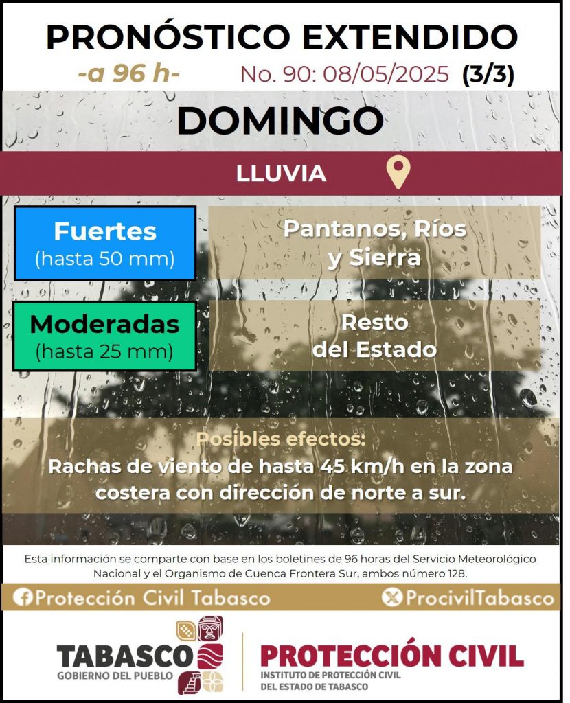 Asimismo, se esperan rachas de viento de hasta 45 km/h. Se recomienda consultar el pronóstico meteorológico extendido a 96 horas para mayor información.