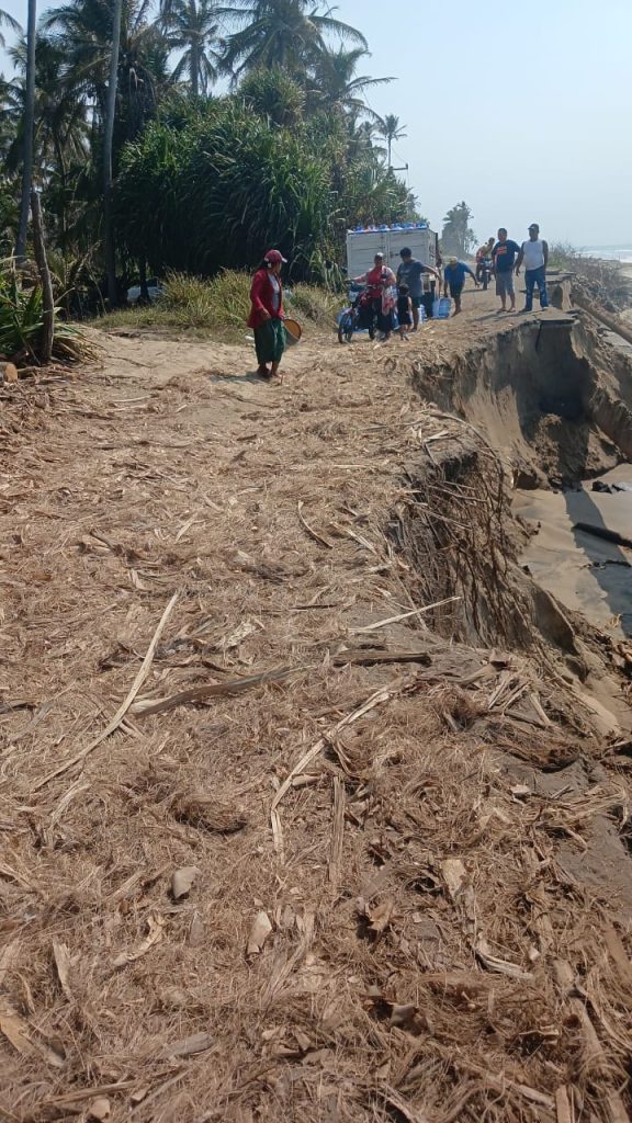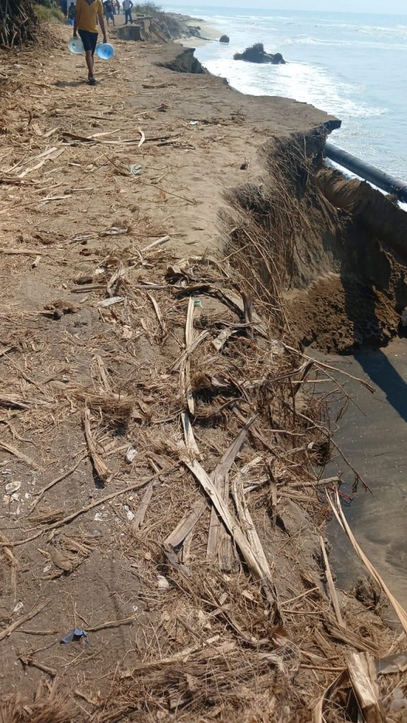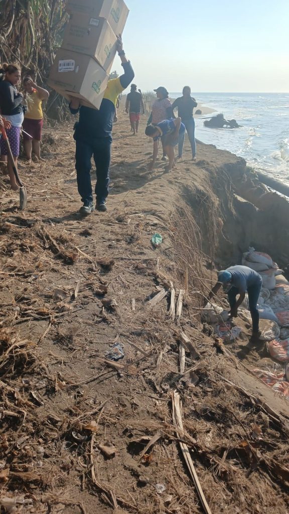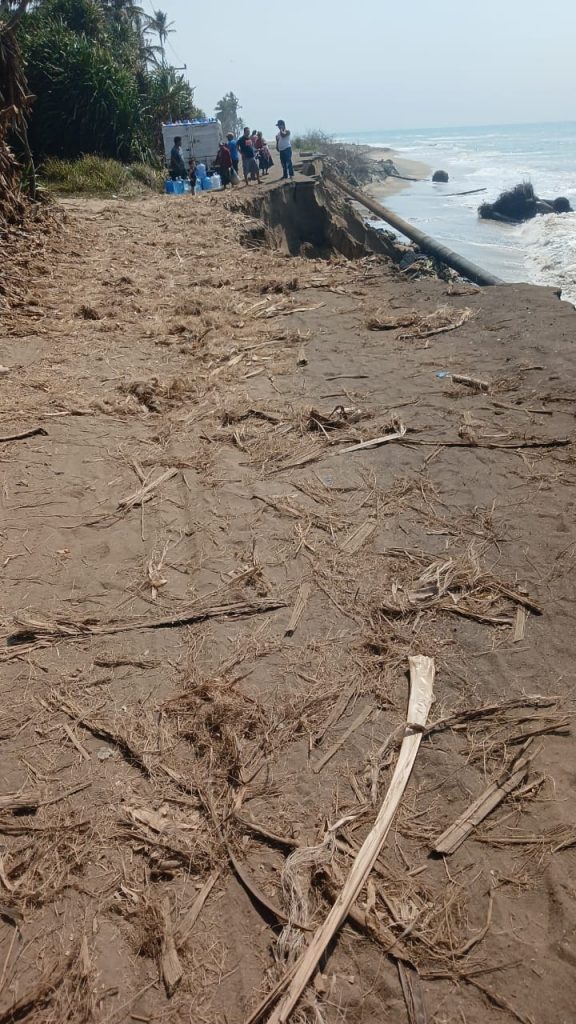 Habitantes del Ejido El Alacrán del municipio unen esfuerzos para evitar quedar incomunicados por la erosión de la carretera costera Sánchez Magallanes-Paraiso.