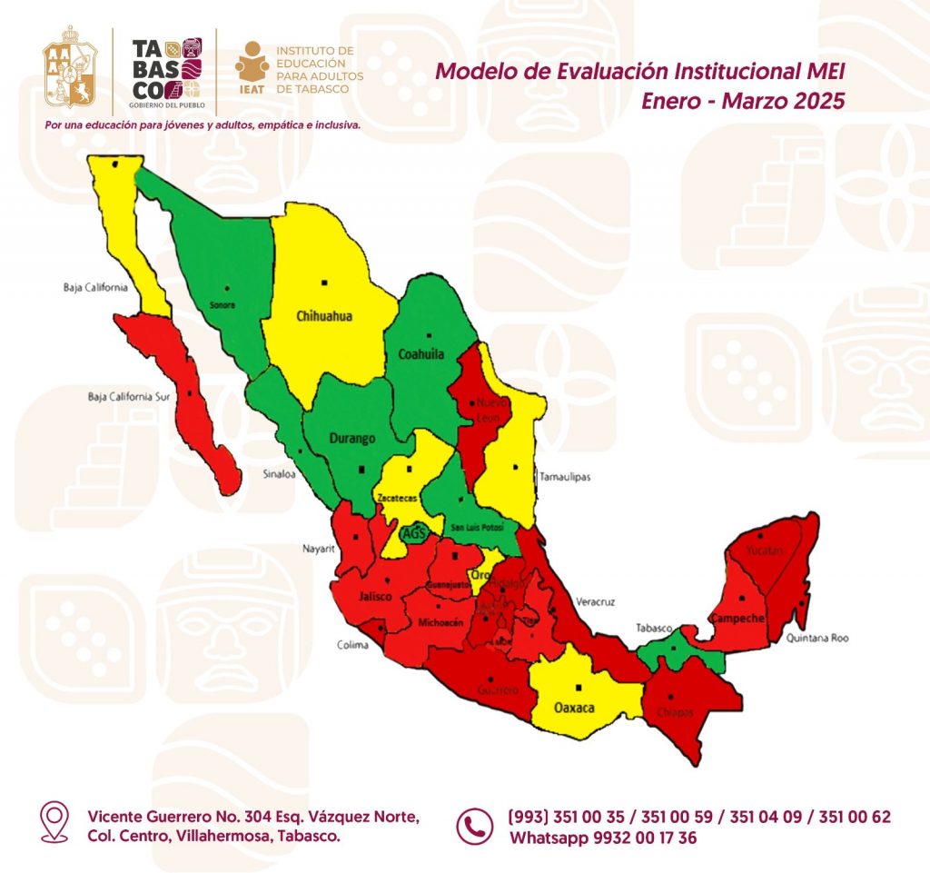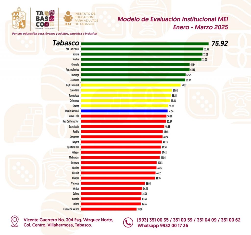 Tabasco ocupa el primer lugar a nivel nacional con la mayor puntuación, alcanzando 75.92 con mayor desempeño en las acciones correspondientes al trimestre Enero-Marzo 2025, se dio a conocer tras la Evaluación trimestral del Modelo de Evaluación Institucional (MEI) que permite medir los logros de los institutos estatales de educación para adultos y unidades de operación del INEA en todo el país.