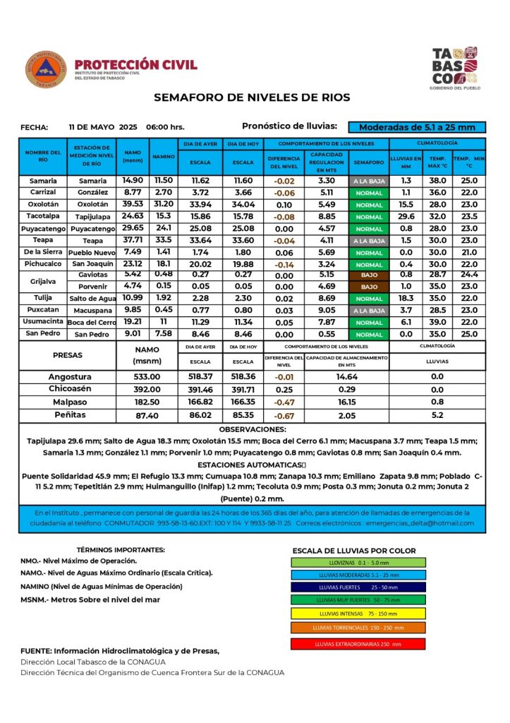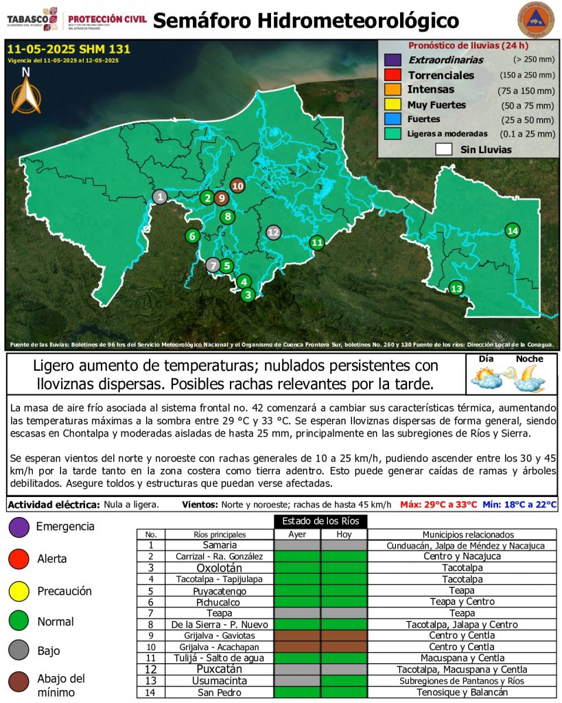 La masa de aire frío asociada al sistema frontal no. 42 comenzará a cambiar sus características térmica, aumentando las temperaturas máximas a la sombra entre 29 °C y 33 °C. Se esperan lloviznas dispersas de forma general, siendo escasas en Chontalpa y moderadas aisladas de hasta 25 mm, principalmente en las subregiones de Ríos y Sierra.