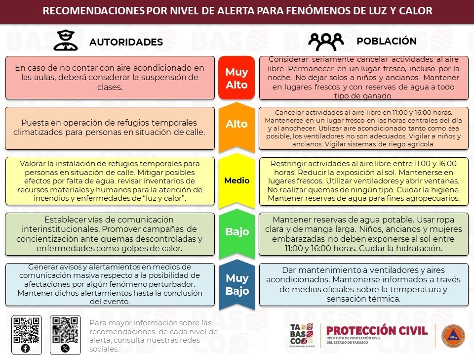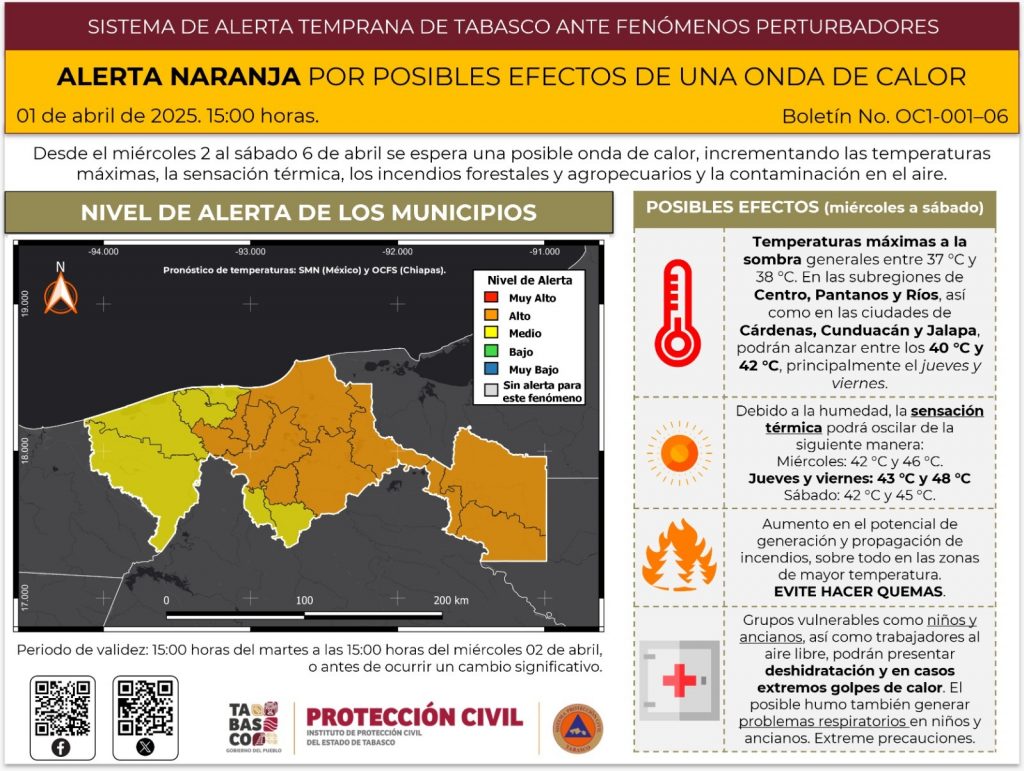 Mediante un comunicado el Instituto de Protección Civil del Estado de Tabasco (IPCET) emitió una alerta naranja debido a los efectos que se esperan ante una onda de calor, que podría afectar a la entidad entre el martes dos y el sábado seis de abril.