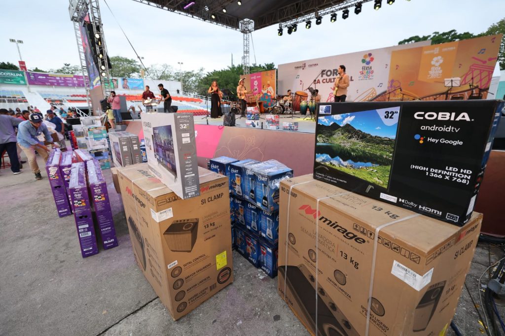 La entrega de obsequios estuvo a cargo de personal de las Secretarías de Turismo, Desarrollo Económico y Cultura, en medio de un ambiente de fiesta, justo antes de la presentación del municipio de Centro en el mismo foro.