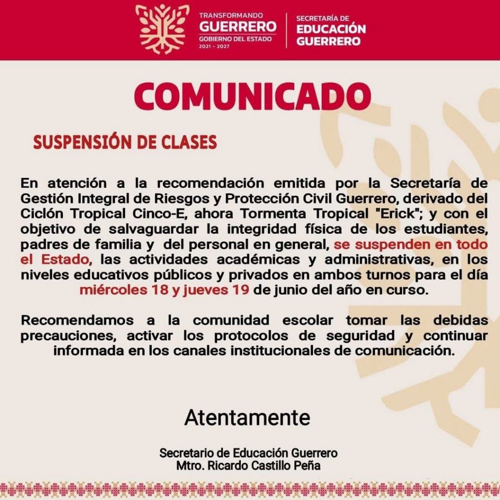 La Secretaría de Educación de Guerrero informó que se suspenden las clases en todos los niveles educativos en el estado este miércoles 18 de junio, como medida preventiva ante el paso de la tormenta tropical “Erick”, la cual podría intensificarse a huracán categoría 2 en las próximas horas.